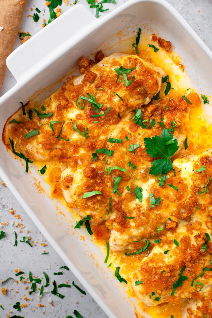 Remove the chicken from the oven and let it rest for 5 minutes before serving. Garnish with freshly chopped parsley and an extra sprinkle of Parmesan cheese. Serve alongside your favorite sides such as roasted vegetables, Caesar salad, or buttered pasta.