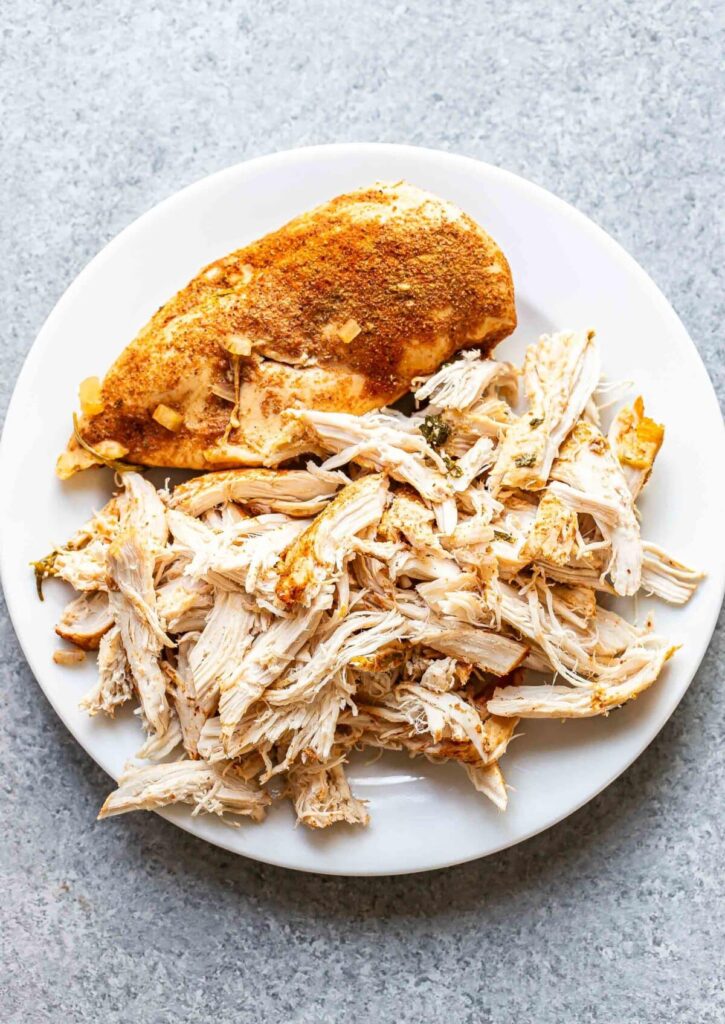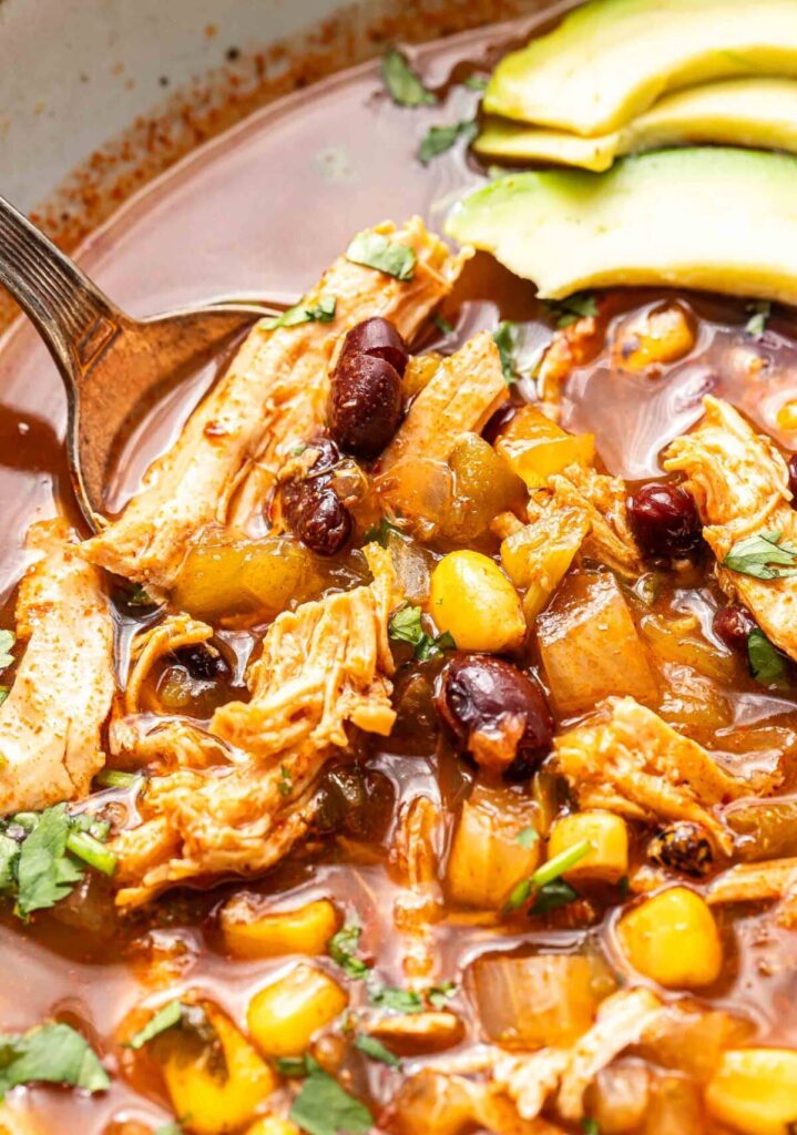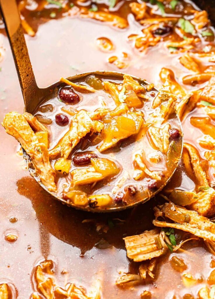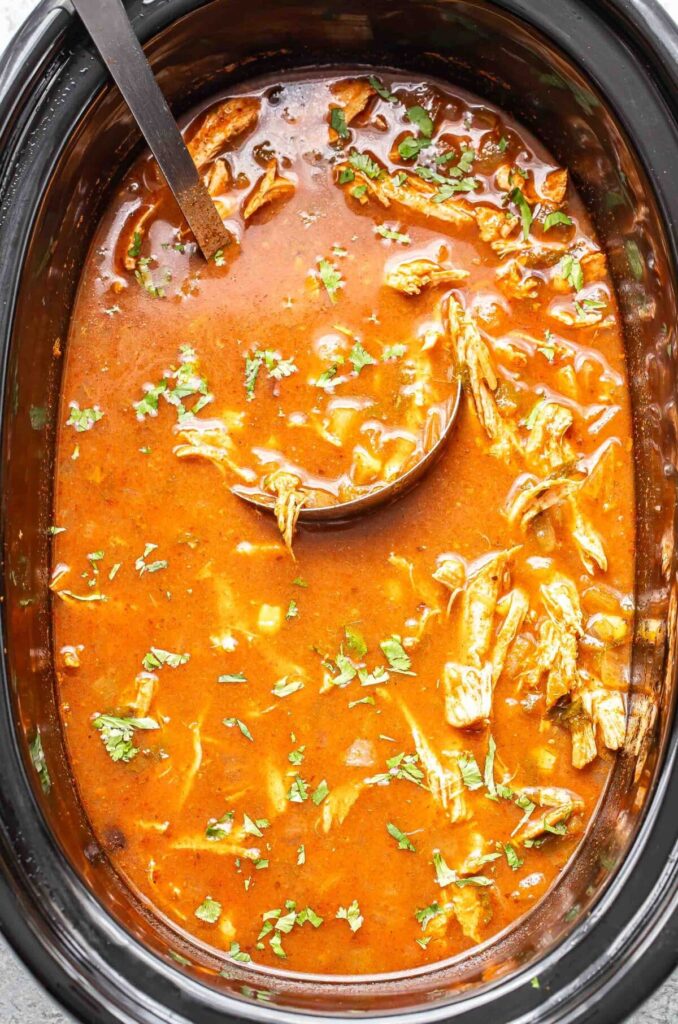 Once the chicken is cooked, remove it from the slow cooker and shred it using two forks. Return the shredded chicken to the soup and give everything a good stir. Taste and adjust the seasoning if needed, then serve with your favorite toppings.